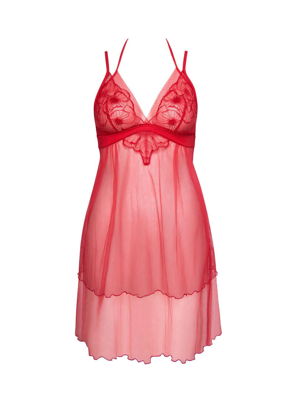 Nuisette audacieuse et légère avec soutien-gorge triangle sans armatures. La partie inférieure en tulle se noue derrière la nuque, tandis que la partie supérieure brodée se règle classiquement au dos. Le bas en double tulle, fermé par une couture décorative, apporte légèreté et élégance.